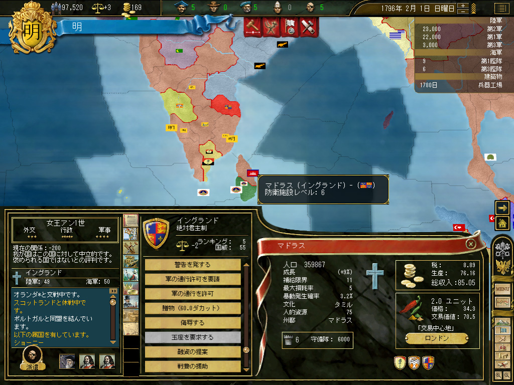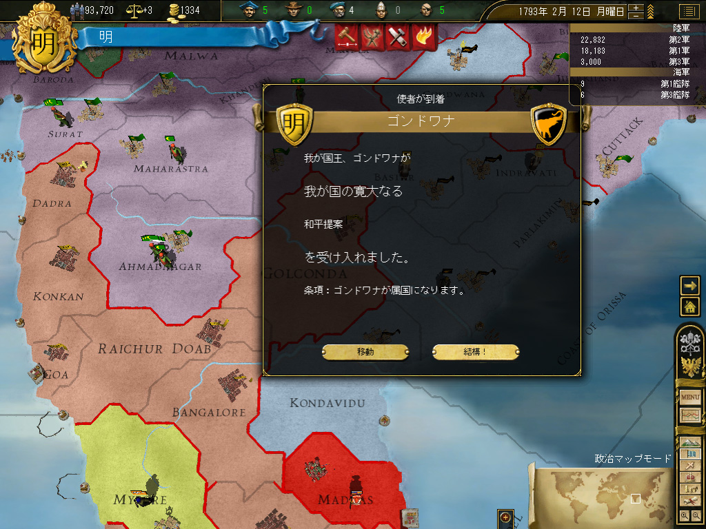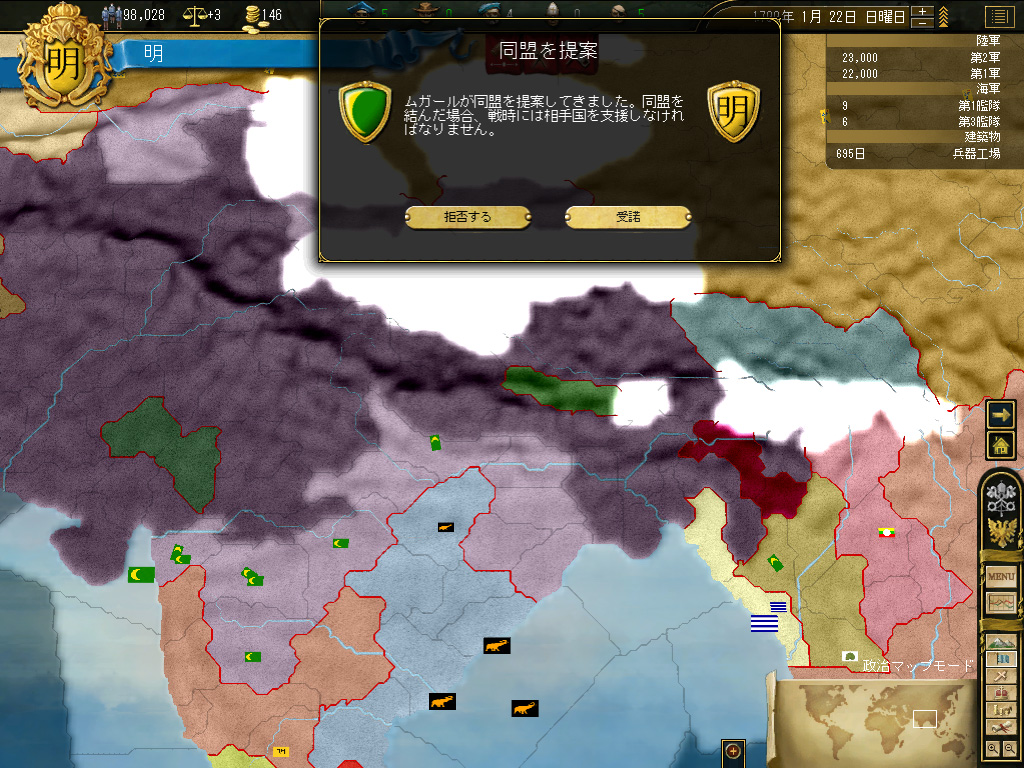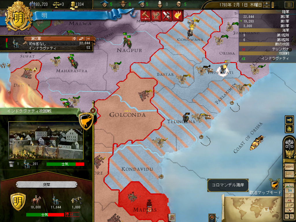 一応,もう一つの攻撃目標としてゴンドワナがあって,こっちはいっさいの同盟関係を持たない外交弱者だったのだが,ムガールに隣接しているという問題を持っていたためパス。ゴンドワナ併合を問題視したムガールから警告(ムガールの隣国に宣戦すると,自動的にムガールが宣戦してくる)されてしまった日には詰んでしまう。