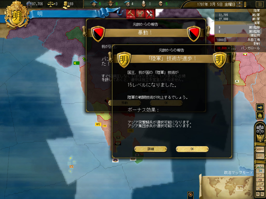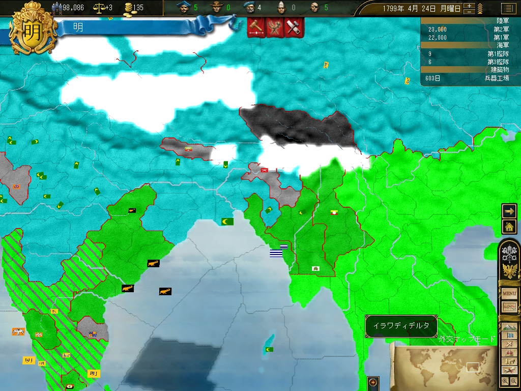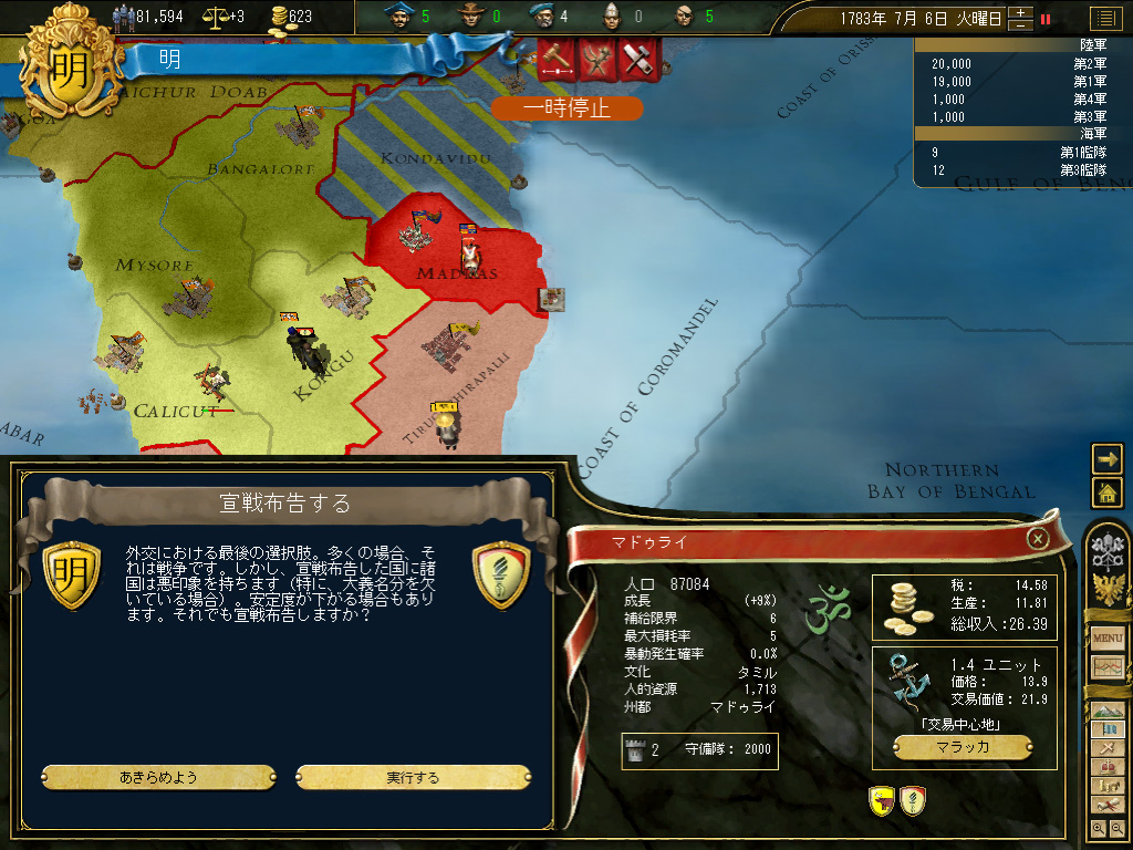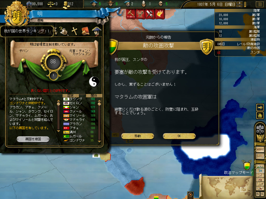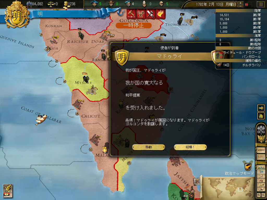 一応,もう一つの攻撃目標としてゴンドワナがあって,こっちはいっさいの同盟関係を持たない外交弱者だったのだが,ムガールに隣接しているという問題を持っていたためパス。ゴンドワナ併合を問題視したムガールから警告(ムガールの隣国に宣戦すると,自動的にムガールが宣戦してくる)されてしまった日には詰んでしまう。
