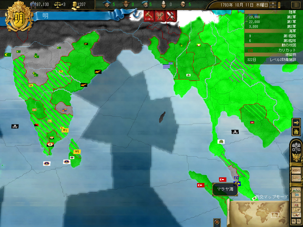 同時に船で南部インドの諸国を索敵。彼らの海軍力は侮れないレベルに達しているので,大型戦闘艦の準備を開始する。幸いマラッカには船の建造速度向上をもたらしてくれる施設があり,すべての船をマラッカで作ったほうが早いくらい,迅速な海軍建設が可能だ。