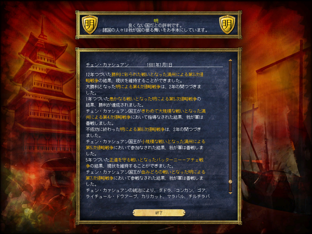 実は両方とも試してみたのだが,前者は一見すると絶望的に思えるものの,経済価値の高いエリアを清に譲渡したあとにひたすら献金を繰り返すと,あら不思議,清から同盟を求めてくるようになる。5年間の停戦期間のうちに金策に励み,あとは御利益を祈りながら献金するだけで,未来は安定してしまう。拍子抜けといえば拍子抜けだ。