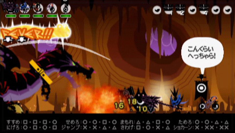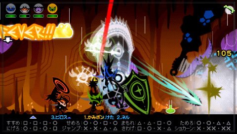 ええ,お気付きのとおりPSPの「パタポン 3」ですよ奥さん。冒頭でいつものようにどうでもよく,そしてちょっといい話風に話題を展開してまいりましたが,すべてはパタポン 3のコマンド入力を表現するためにしていたこと。文章を通じて,すすんでさわいでためてせめてみたわけね。