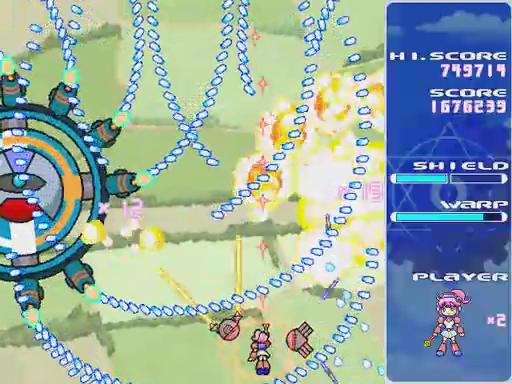 そしてもう一つの特徴がトキトメワープ。これはその名のとおり時を止めてワープするという反則技で,その間は敵機や敵弾を通過できる。まさに,科学と魔術が交差することで生まれたメグリロの切り札で,これなしでは1面クリアすらおぼつかない。トキトメワープの発動中は,画面右側のワープゲージが減少していき,ゲージが続く限り時間を止めていられる。ワープゲージは,トキトメワープを使っていない間に徐々に回復するので,あまりケチらずに使っていくのがいいだろう。