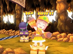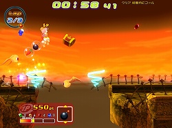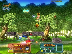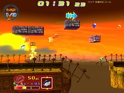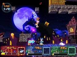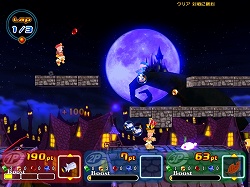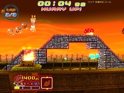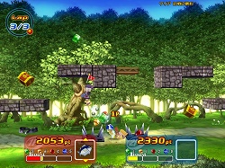 それはともかくとして,ゲームとしては実はこちらが本番で,一人で行うタイムアタックは,むしろ練習ステージだと言ってもいいだろう。ライバルとの対戦ステージでは,ゴールインした順位ではなく,ゴールまでに稼いだポイント数で勝敗が決定される。先にゴールすればもちろん有利になるが,アイテムを使っていかに相手の邪魔をし,魔法石を取って差を広げるかが重要となる。
