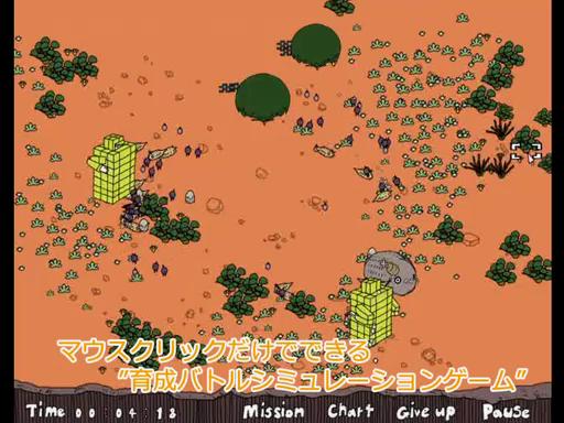 チャレンジモードの中盤以降のステージではいよいよ敵である“機械”が登場し,生き物達に襲い掛かってくる。本作は,ここからが本番といってもいい。動植物をいともたやすくぷちっと殺ってしまえるプレイヤーだが,なぜか機械達には無力だ。神なのに! 機械達には,手塩にかけて繁殖させた植物や動物達で立ち向かうしかない。生き物には,接近戦に強いものや弾を飛ばして遠距離攻撃をするものなどがいるので,うまく進化を誘導して機械達をやっつけよう。