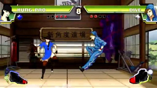 キャラクターを前進させるには,上述のダイブキックを使用する。本作では,移動と攻撃がまさに一体となっており,ダイブキックによって敵との間合いを測り,ダイブキックで敵にとどめを刺す……そう,移動こそが最大の攻撃なのである! というか,ぶっちゃけそれしかない。また,地上でキックボタンを押すと,軽く後方にバックステップを行い,敵との間合いを離すことができる。