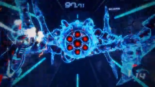 また,自機の周囲にはもう一つ,赤色で示されたオーバードライブゲージがあり,このゲージを消費することで,すべての敵弾を破壊するEMPショットやオーバードライブモードを発動可能。もちろんこのほかに,左右の回転ボタンを使って空間を回すという操作がある。本作では背景にも敵や障害物が隠れていたり,アイテムが入ったコンテナが設置されていたりするので,ステージをぐるぐる回転させて探してみよう。