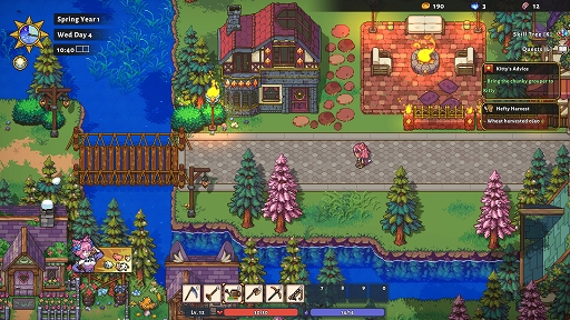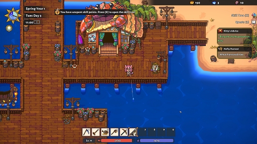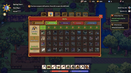 キャラクターメイクを終えたら,いよいよサンヘイブンでの新しい生活の幕開けだ。本作では,探索,農業,採掘,戦闘,釣りという5系統のスキルがあり,行動に応じて経験値を獲得できる。経験値が一定に達するとレベルが上がり,スキルポイントを消費してさまざまなスキルを習得していくというのが大まかなゲームの流れだ。何をするのも自由だが,まずは自宅の周りに小さな畑を作って作物を育ててみるのがいいだろう。
