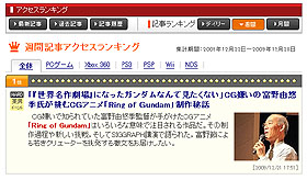 12月,若者の血潮を熱くたぎらせたのは富野由悠季氏であった。12月の第1位,SIGGRAPH Asia 2009における富野氏の講演“CGアニメ「Ring of Gundam」制作秘話”だ。CG嫌いで有名な富野氏が手がけたCGアニメは,どうだったのか。「アバター」を観た富野氏は,どんな感想を抱いたのか。なぜFFに対して『潰れろ!』って思ってるのか。すべての答えがここに!