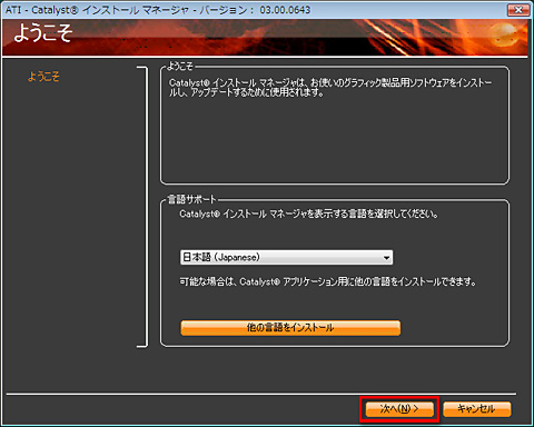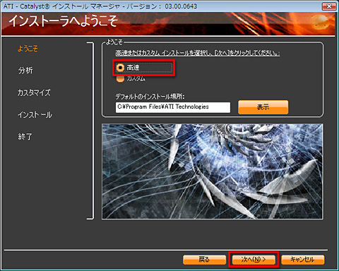 (6)ATI Catalystロゴが表示されてから,ATI Catalystインストールマネージャが起動する。この画面ではとくに設定を変更する必要がないので[次へ]進む