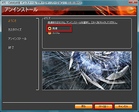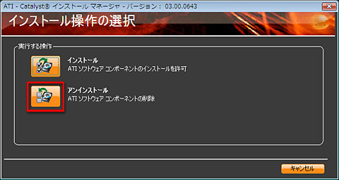 (エラーまでの流れ2)ATI Catalyst Install Managerが起動したところで「アンインストールマネージャ」を選んで[次へ]