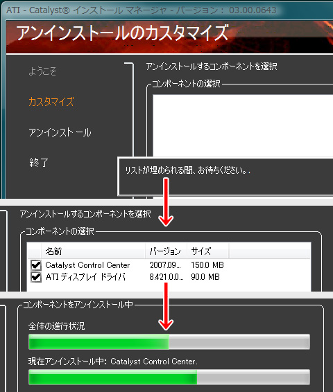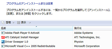 グラフィックスドライバ→ATI Catalyst Control Centerという順番で,間にPCの再起動を挟みつつ行う。また先ほど,アンインストールに当たって,ATI Catalystのインストールファイルを実行し「ATI Catalystインストールマネージャ」のアンインストール機能を利用したことからも分かるように,