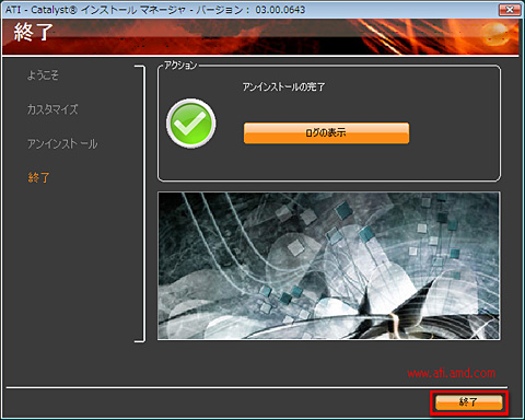 (10)チェックマークと「アンインストールの完了」の文字が表示されたら,[終了]をクリックしてATI Catalystインストールマネージャを閉じる
