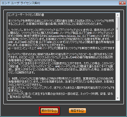 (14)使用許諾条件を示した「エンドユーザライセンス契約書」が表示されるので,よく読んでから[受け付ける]をクリックする
