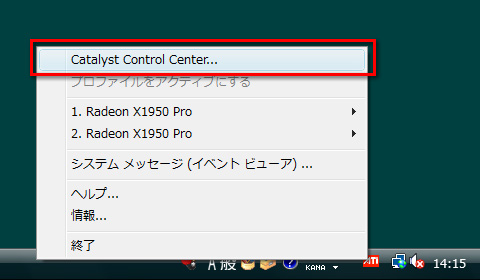 (1)タスクトレイにあるATIロゴを右クリック(※デスクトップ上の何もないところを右クリックでも可)するとメニューが表示される。ここにATI Catalyst Control Centerへのショートカットがあるので,これをクリックしよう