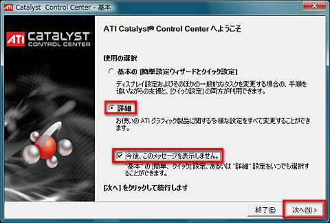 (2)初回起動時には“ようこそ画面”が表示される。ATI Catalyst Control Centerには,「基本」と「詳細」の2モードが用意されているが,「詳細」のほうが直感的に操作できるので,こちらを選択する。「今後、このメッセージを表示しません。」にチェックを入れ,[次へ]