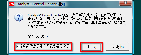 (3)確認メッセージが表示される。「今後、このメッセージを表示しない。」にチェックを入れて[はい]をクリック