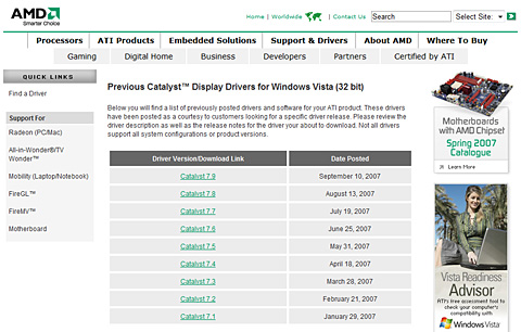 第9回で紹介したAMD GAME!より。Windows Vista用ドライバをダウンロードできるページの一番下に「Previous Drivers and Software」(過去のドライバとソフトウェア)というリンクがある