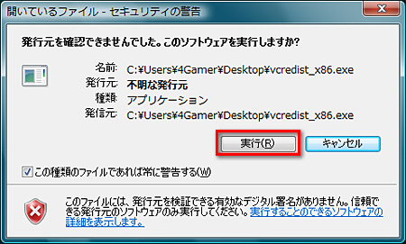(2)ひとまず今回は,ファイル名に「ccc」という文字(※cccの意味については後述。連載第9回でも説明している)がないほうを実行した。「発行元を確認できませんでした」と警告されるが,ファイルはAMDから入手したのものなので,信頼して[実行]をクリック