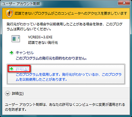(3)Windows Vistaユーザーにはおなじみの「ユーザーアカウント制御」ウインドウが表示される。もちろん[続行]だ