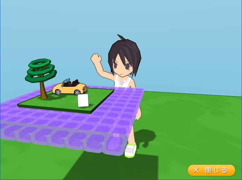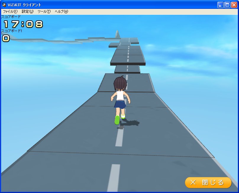 まず,考えられるのは,ViZiMOの基本機能だけを使用してゲームを作ることです。先月のレースゲームも,レース部分自体はViZiMOの基本機能しか使っていないのですが,それでも周回を数えたり,ランキング処理で複雑なことをやっていました。これが,周回型ではなくて,構造的に直線の競争だったら,ゴール時の判定くらいで済みますので,かなり簡単になります。シングルプレイヤー専用のゲームにすれば,ゴール地点のオブジェクトとプレイヤーとの接触判定で,勝利フラグと終了イベントを並べれば,ゲームになってしまいます。