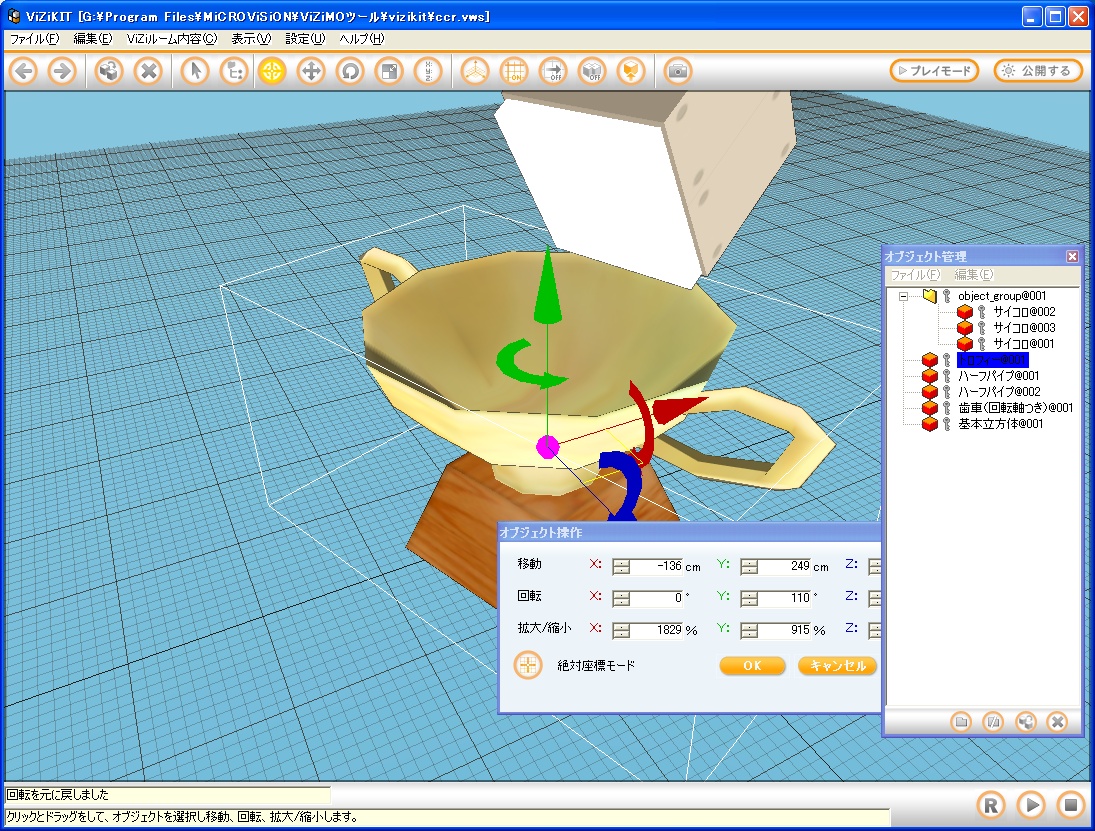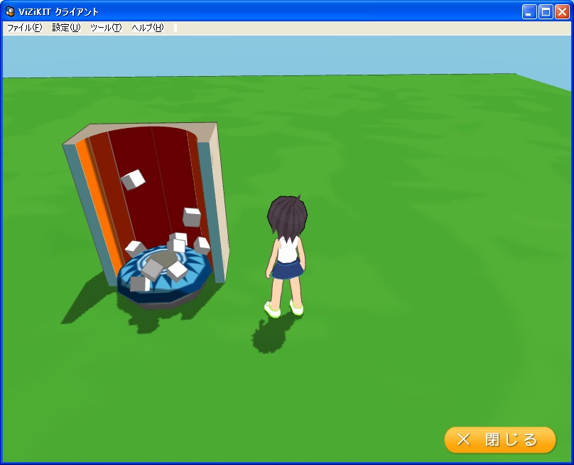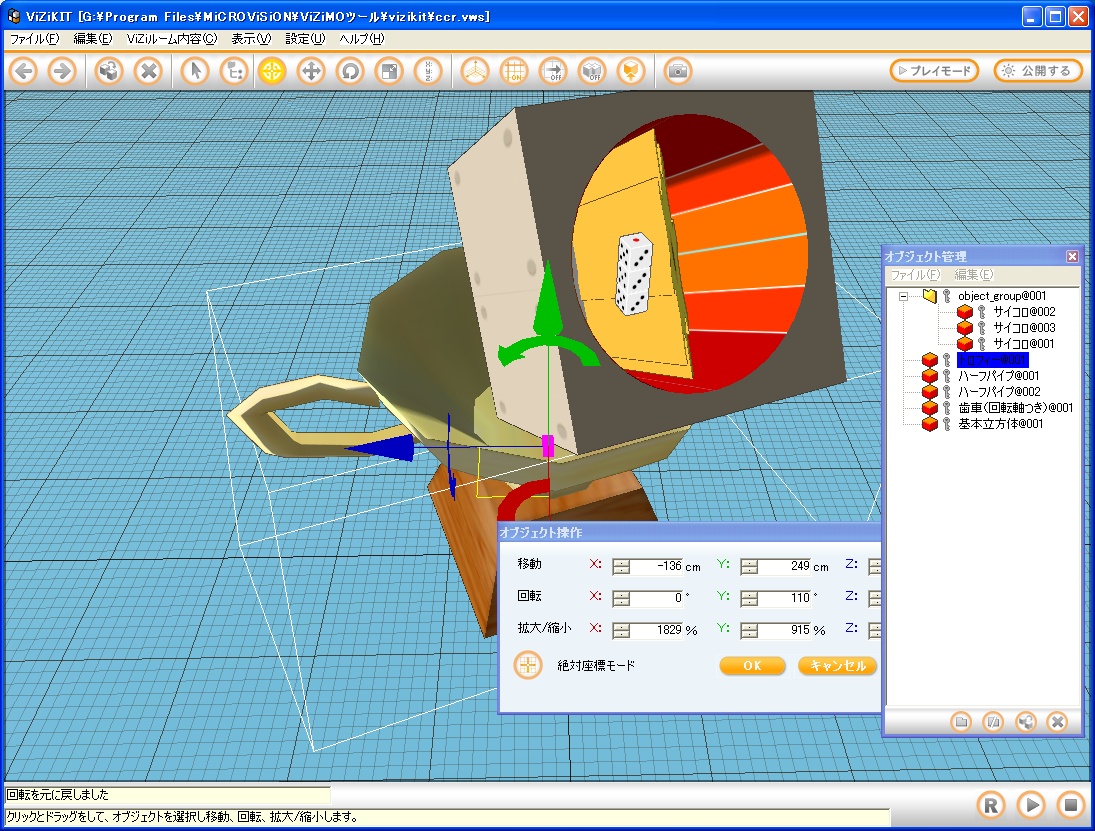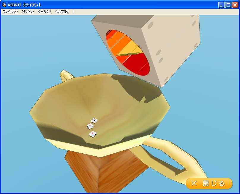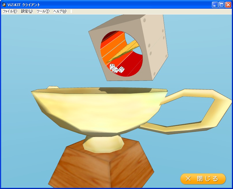 また,現実世界と同様に,オブジェクトとして用意されているサイコロを振ってみるというのも手ではあります。ViZiMOのシステムでは,サイコロのどの面が上を向いているかなどは,判定できないのですが,マルチプレイヤーゲームであれば,プレイヤーが判断してゲームを進めるという展開もありでしょう。