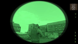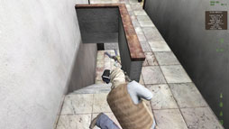 ![]() 建物の2階にいたら,1階から激しい銃声が聞こえたので覗き込んでいるところ。2階は袋小路で逃げられないので,背後からの強襲で相手を無力化し,無事に生き延びることができた |