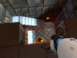 左クリックで作った壁のブルーポータルに入れば,同じ部屋の天井に右クリックで開けたオレンジポータルから落っこちてくるといった仕掛けになるので,壁やシールド設備があって行けないはずの場所に行ったり,ボタンを作動させるための箱をちょっと思いつかない方向に動かしたりといったことが可能になる。