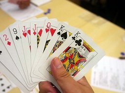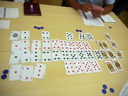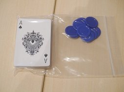 ![]() 各テーブルには,ジョーカーを抜いたトランプと,プレイヤー各人のパス可能回数を示すチップが配られた |