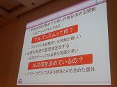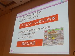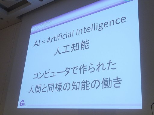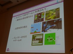 遠藤氏はまず,「AIとは何か」という基本的な部分から説明を開始した。AIとは人工知能のことで,「コンピュータで作られた,人間と同様の思考の働き」のことである。ゲームにコンピュータが導入され,対戦相手をAIが肩代わりするようになったことで,対戦ゲームを1人で遊ぶことが可能になった。