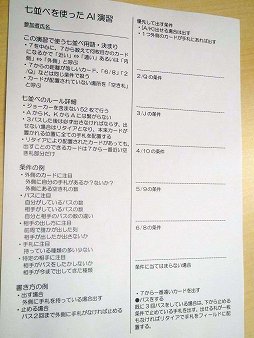 今回のワークショップのテーマは,ひと言で表わすと「七並べを遊ぶことで,自分の思考をAI化する」というもので,「良くできたAIとはどういったものか」を体感できるという内容だ。