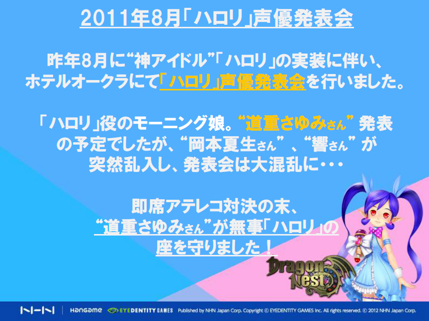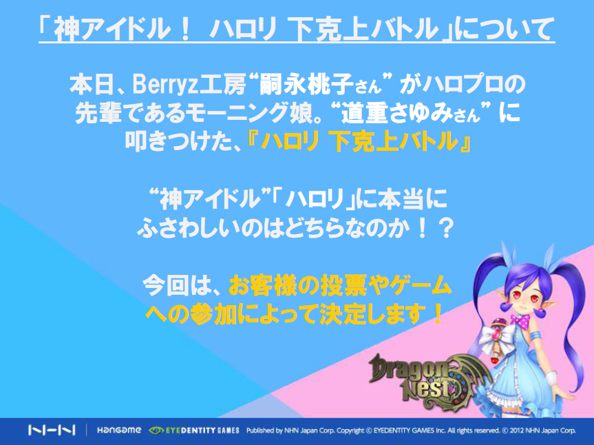 絶対的神アイドル“ハロリ”の声優役をかけて,嗣永桃子さんが道重さゆみさんに下克上宣言。「ドラゴンネスト」記者発表会