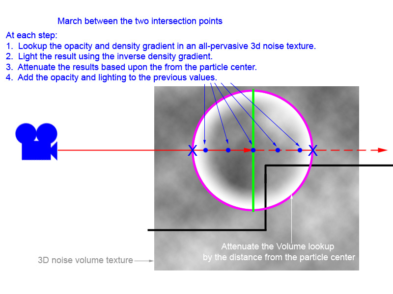 あるピクセルをレンダリングするときは,まさにCTスキャンで輪切りにしたイメージになるボリュームテクスチャからフォグの濃度と色を取り出し,当該ピクセルの透明度を算出(=ライティング計算を実行)する。断面図から実態を再構成する,いわゆるボリュームレンダリングを行うわけだ。