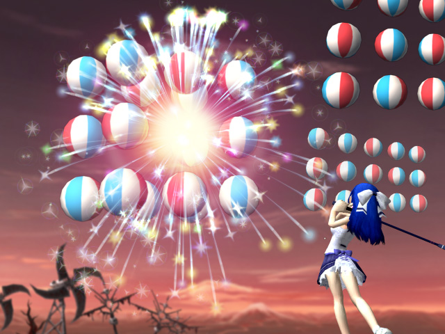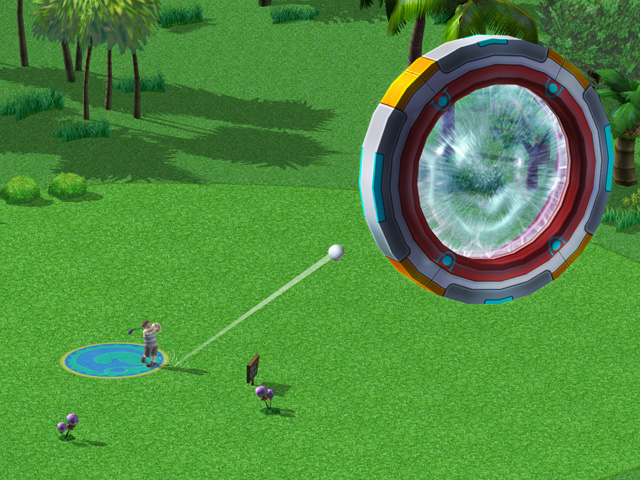 勝つための秘訣は,コース上に何か所か設置されている,鏡のようにユラユラゆらめくリング。ボールがこのリングをうまく通過すると,未知のエネルギーによってブーストがかかり,一気に飛距離が伸びるのだ。リングはそれなりに大きく狙いやすいサイズなのだが,パンヤでは風速と風向がボールの軌道に大きな影響を与えるため,そうそう簡単には通過させてくれない。おまけに,せっかくブーストがかかっても,方向が悪いとそのままO.B.扱いでノーカウントという哀れな結果も待っている。