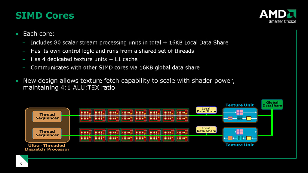 それは「Local Data Share」と呼ばれる,容量16KBの共有メモリで,ズバリ,GeForce GTX 200シリーズにおいて1基のStreaming Multi-processor(=8基のSP)で共有される「Local Memory」(ローカルメモリ,LM)に相当するものだ。Local Data Shareは,SIMD Unit(=5SP)で実行したスレッドの結果を,ほかのSIMD Unitで共有,そして連携するために利用される。