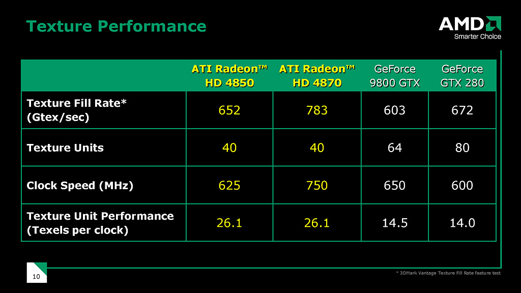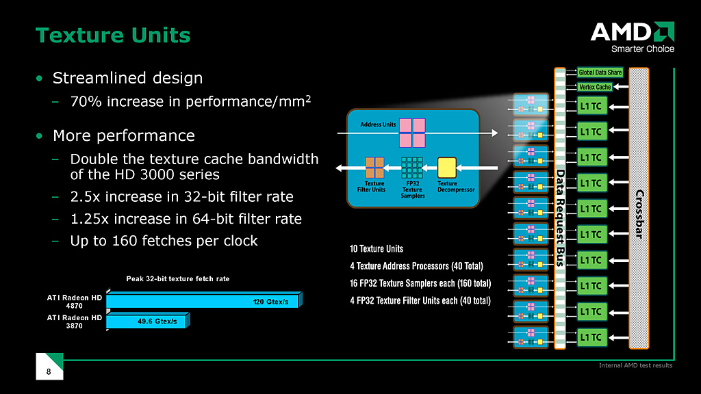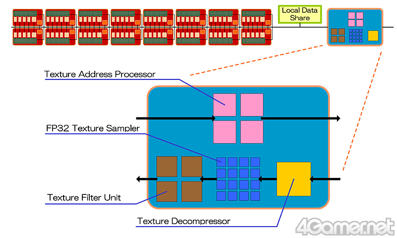 AMDが公開している資料だと,テクスチャユニット数は40基と記載されていたりもするが,これはテクスチャユニットのクロック当たりスループットが,バイリニアフィルタ・テクセル4個分であるため。バイリニアフィルタリング適用済みFP32テクスチャのクロック当たりスループットが1基当たり4テクセルなので,全体としては40テクセルであることを受けた,数字のマジックだ。
