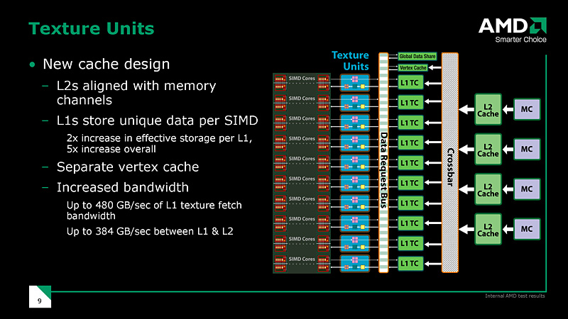 AMDは,GPUの内部バスに相当な力を入れて設計したとのことで,L1キャッシュのフェッチ速度は480GB/s,L1およびL2キャッシュはクロスバーを介した状態で384GB/sという,極めて広い帯域幅を実現しているという。