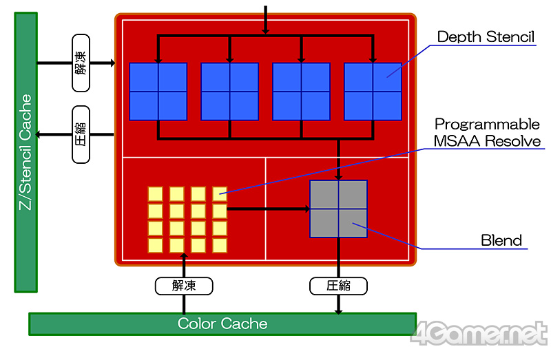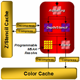 これは直接的にはZ(デプス)入出力,ステンシル入出力を2倍にしてくれる効果がある(※入出力自体はキャッシュに対して行われるので,ブレンド処理ユニットと同様,リニアな性能向上は保証されない)のだが,それだけではなく,MSAA(マルチサンプル・アンチエイリアシング)の高効率実行にも結びつく。