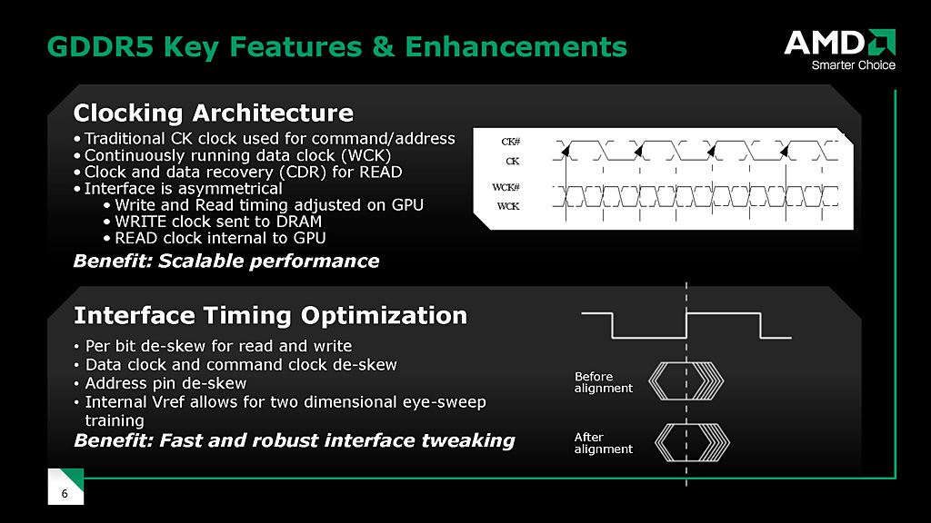 GDDR5はベースクロックの4倍の外部クロックで動作。自動de-skew機能を搭載している