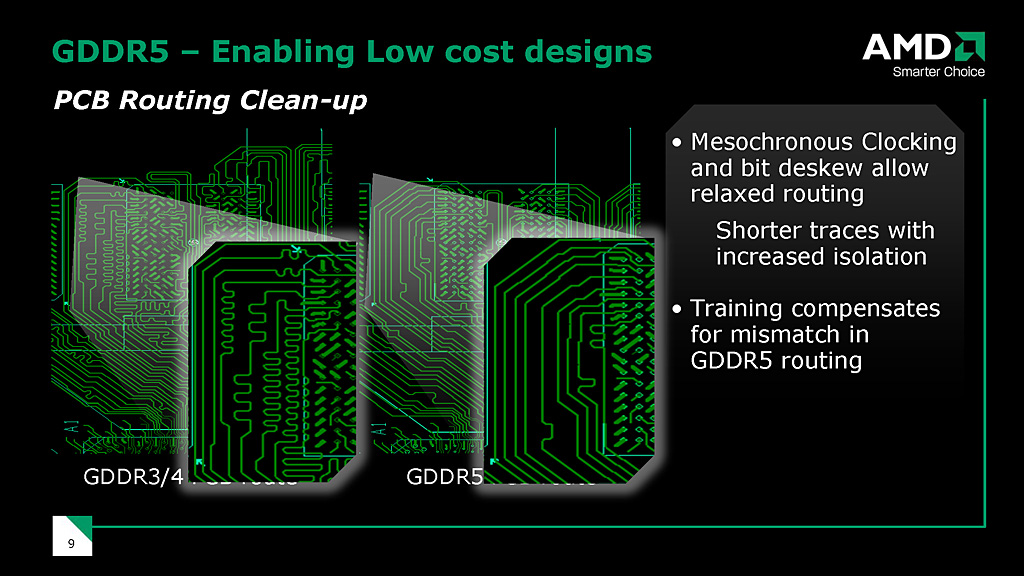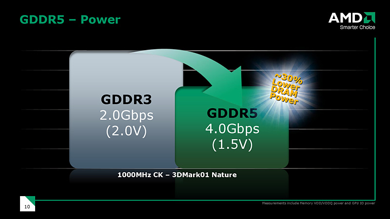 GDDR5は駆動電圧がGDDR3の1.8Vに対して1.5Vとなり,消費電力的にも優位とAMDはアピール