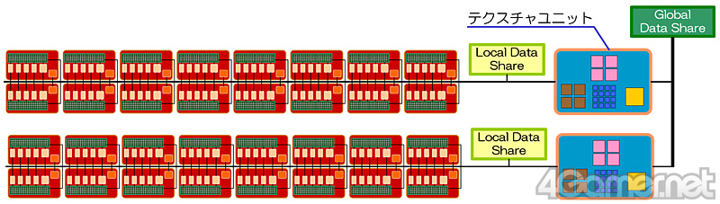 また,SIMD Core(=16SIMD Unit)をまたぐようなデータ共有,データを媒介とした処理連携のために,やはり容量16KBの「Global Data Share」も搭載されている。