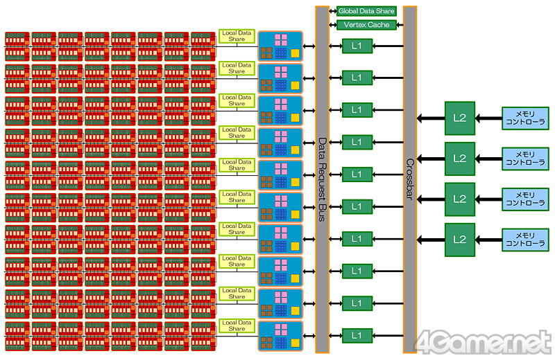 あらためて整理してみると,L1キャッシュとL2キャッシュのデザイン,そしてメモリコントローラとキャッシュシステムの接続形態は,GeForce 8800/9800/GTX 200シリーズとよく似ている。意地悪な見方をすれば「AMDはここ数世代の間,試行錯誤を重ね,ATI Radeon HDの内部バス設計をGeForce的にした」ともいえるだろう。