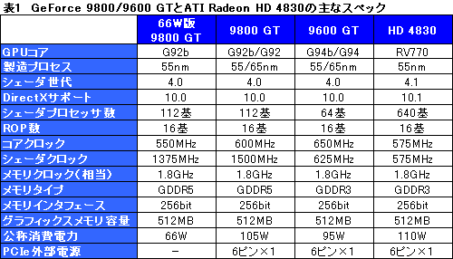以上のことから,55nm版GPUを搭載する通常版9800 GTに対して,消費電力66W版9800 GTがより低い消費電力を実現しているのは,主にカードデザインの最適化と,動作クロックの引き下げによるものである可能性を指摘できそうだ。もちろん,「消費電力66W版は選別品」という可能性もあったりするため,断言はできないが,55nm版GPUを搭載した9800 GTから,劇的に消費電力が改善しているわけではないのも,また確かである。