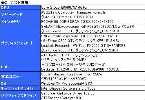 テスト環境は表2のとおり。今回は,先ほど紹介したGF P98GT/512D3/TT,編集部で用意したLeadtek Research製9600 GTカード「WinFast PX9600 GT S-FANPIPE」,そして,AMDの日本法人である日本AMDから貸し出しを受けたHD 4830リファレンスカードを比較対象として用意している。
