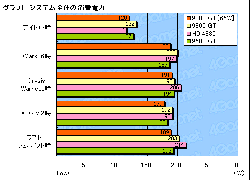 その結果がグラフ1で,同じ55nmプロセス版の9800 GTを搭載した通常モデルと比べると,消費電力66W版9800 GT(※グラフ中は「9800 GT[66W]」。以下同)は,アイドル時で約10%,アプリケーション実行時に2〜7%ほど,消費電力が低減しているのを見て取れる。通常版9600 GTより,ほんのわずかに低いレベル,ともいえそうだ。