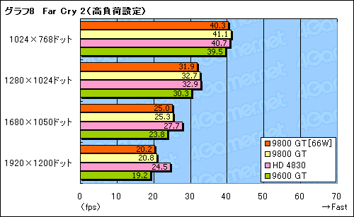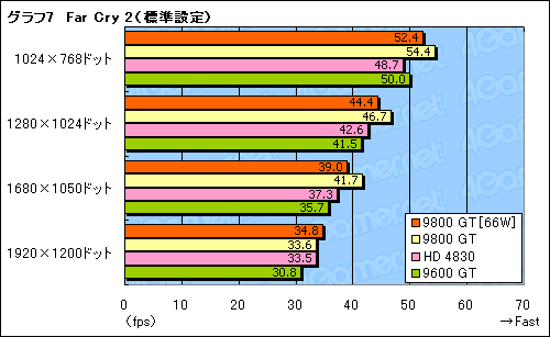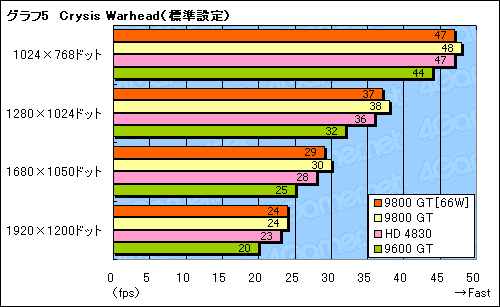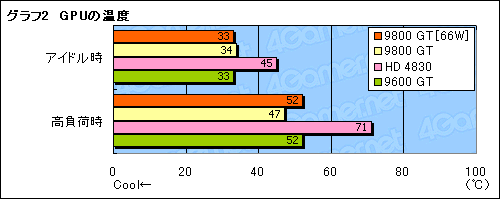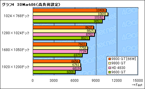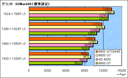 消費電力66W版9800 GTのスコアは,通常版9800 GTの96〜98%。クロック引き下げの影響は避けられないが,そう大きくもない,といった印象を受ける。高負荷環境に強いHD 4830に対しても,標準設定では互角以上に立ち回れているうえ,9600 GTには全般的に亘(わた)って完勝だ。