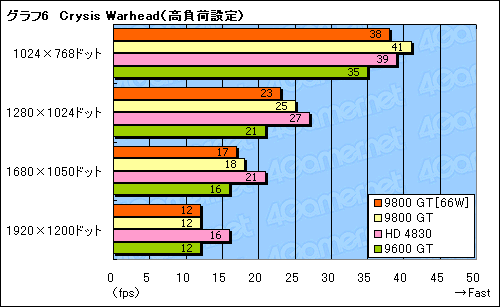 グラフ5,6は,実際のゲームタイトルから,Crysis Warheadの結果をまとめたもの。高負荷設定時は描画負荷が高すぎて,ほとんど比較にならないが,標準設定の,とくに1680×1050ドット以下では,3DMark06と同じ傾向を示しているのが分かる。