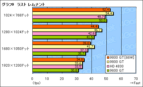 ベンチマークレギュレーションから外れて,Far Cry 2とラスト レムナントのスコアをまとめたのがグラフ7〜9だ。いずれも,標準設定の1920×1200ドットにおいて,GPUボトルネックによるスコアの乱れが生じているが,それ以外では「通常版9600 GT以上,通常版9800 GT未満」のところに落ち着いている。