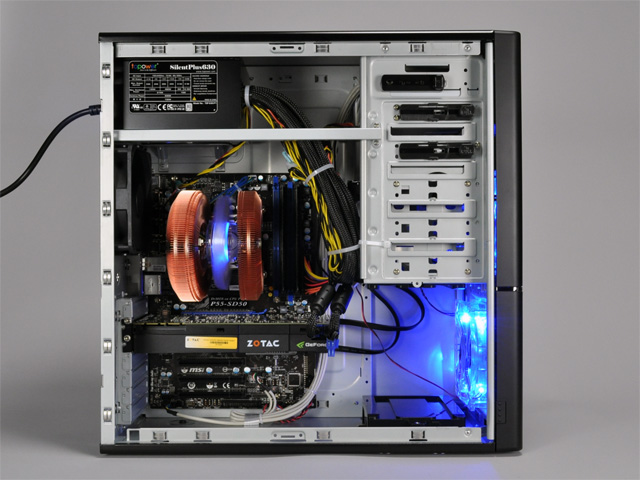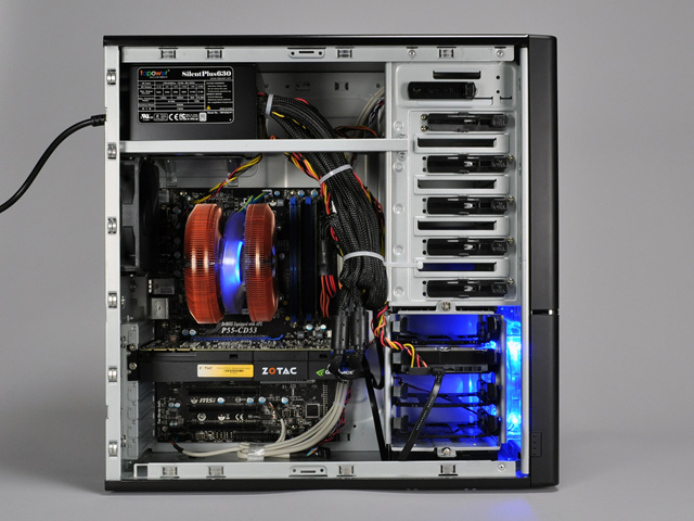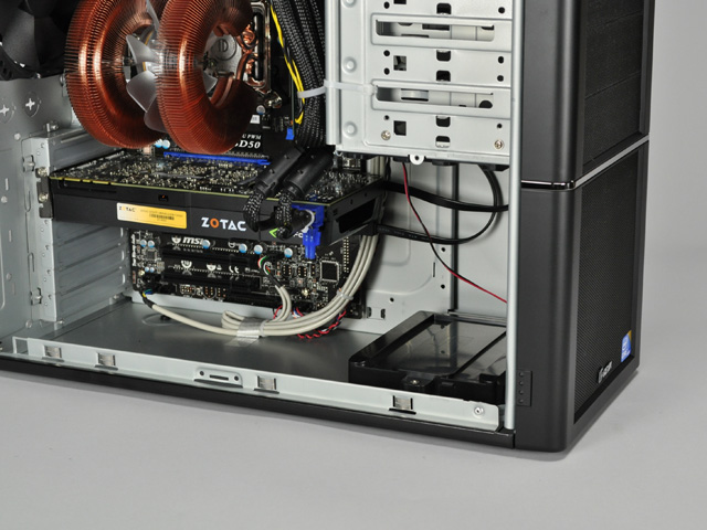 まず分かりやすいのは,ドライブベイが取り外されたことで,PCケース前面に取り付けられた120mm角吸気ファンのエアフローが直接グラフィックスカードへ向かう点。そしてもう一つは,5インチベイ3段を使うタイプの3.5インチドライブマウンタを新設し,そこにも120mm角吸気ファンを搭載することで,HDDを冷却しつつ,サイドフローのCPUクーラーから排気ファンへと,直線的なエアフローを作り出せているということだ。