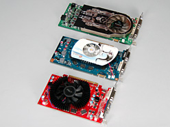 さて,公称消費電力59W版9600 GTと,Palit 9600 GT,公称消費電力96W版となる従来型9600 GT,そして価格的に競合となる「ATI Radeon HD 4670」(以下,HD 4670)の主なスペックは表1のとおり。Palit 9600 GT以外はリファレンスクロックとなるが,59W版9600 GTでは,コアクロックとシェーダクロックが96W版から下げられ,Palit 9600 GTと同じ水準になっている。シェーダプロセッサ数やメモリ周りのスペックはそのままに,GPUクロックだけを引き下げることで,補助電源コネクタを必要としないカードデザインを実現しているわけだ。