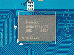 搭載するメモリチップはHynix Semiconductor製の「H5RS5223CFR-N0C」(1.0ns品)。これを8枚搭載することで,グラフィックスメモリ容量512MBを実現している,メモリチップ自体は2GHz相当(実クロック1GHz)での動作が可能なので,GF9600GT-E512HW/HD/GEでは,200MHz相当のマージンが設けられている計算だ。
